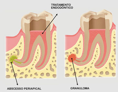 A figura abaixo esquematiza dentes com tratamento de canal realizados porém com presença de lesões apicais (à esquerda abscesso e à direita granuloma):